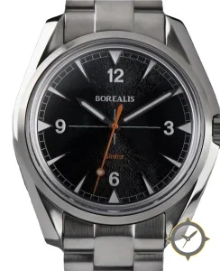 Eine Field-Uhr mit einem vielseitigen 41mm Gehäuse, das an fast jedes Handgelenk passt, gefertigt aus Edelstahl mit einem Zifferblatt in schwarz und einer besonderen "sunburst (radial brushing)"-Oberfläche.