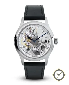Eine Skelett-Uhr mit einem markanten 48mm Auftritt am Handgelenk, gefertigt aus Edelstahl mit einem Zifferblatt in silber und einer besonderen "skeletonized, open-worked with visible movement and engraved bridges"-Oberfläche.