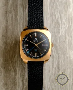 Eine GMT-Uhr mit einem 32.5mm Gehäuse im Vintage-Stil gefertigt aus Gold mit einem Zifferblatt in schwarz und einer besonderen "matte"-Oberfläche und einer echten GMT-Funktion, mit der du eine zweite Zeitzone verfolgen kannst.