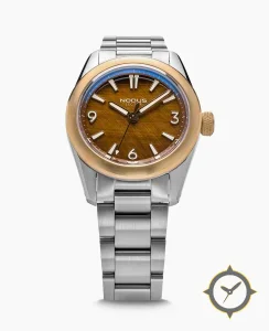 Eine Field-Uhr mit einem vielseitigen 39mm Gehäuse, das an fast jedes Handgelenk passt, gefertigt aus Edelstahl mit einem Zifferblatt in braun und einer besonderen "woodgrain"-Oberfläche.