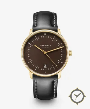 Eine Minimalistisch-Uhr mit einem vielseitigen 39.5mm Gehäuse, das an fast jedes Handgelenk passt, gefertigt aus Gold mit einem Zifferblatt in braun und einer besonderen "matte"-Oberfläche.