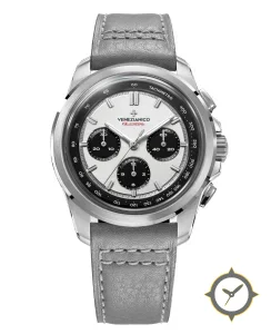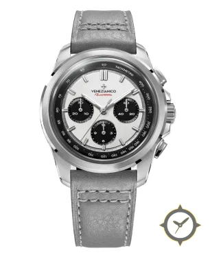 Eine Chronograph-Uhr mit einem markanten 43.5mm Auftritt am Handgelenk, gefertigt aus Edelstahl mit einem Zifferblatt in weiß und einer besonderen "matte-silver"-Oberfläche.