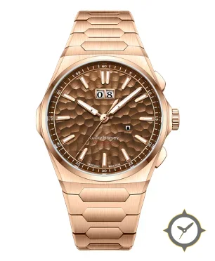 Eine Luxus-Uhr mit einem markanten 43mm Auftritt am Handgelenk, gefertigt aus Gold mit einem Zifferblatt in braun und einer besonderen "hammered"-Oberfläche.