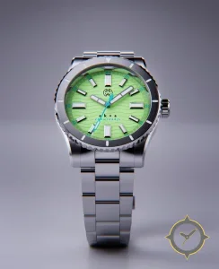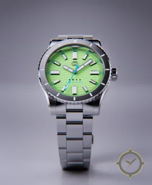 Eine Taucheruhr-Uhr mit einem 35mm Gehäuse im Vintage-Stil gefertigt aus Edelstahl mit einem Zifferblatt in grün und einer besonderen "wavy"-Oberfläche.
