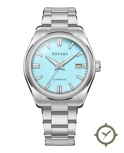 Eine Dress-Uhr mit einem markanten 46mm Auftritt am Handgelenk, gefertigt aus Edelstahl mit einem Zifferblatt in türkis und einer besonderen "smooth lacquer"-Oberfläche.