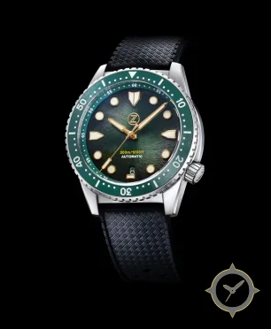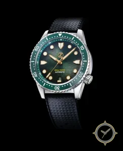 Eine Taucheruhr-Uhr mit einem markanten 44.5mm Auftritt am Handgelenk, gefertigt aus Edelstahl mit einem Zifferblatt in grün und einer besonderen "sunburst / radial textured"-Oberfläche.