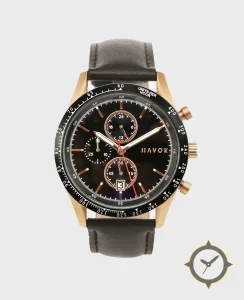 Eine Chronograph-Uhr mit einem 34.5mm Gehäuse im Vintage-Stil gefertigt aus Edelstahl mit einem Zifferblatt in schwarz und einer besonderen "lacquer"-Oberfläche.