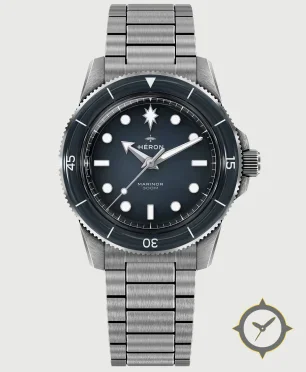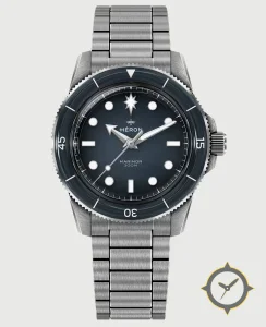Eine Taucheruhr-Uhr mit einem vielseitigen 41mm Gehäuse, das an fast jedes Handgelenk passt, gefertigt aus Edelstahl mit einem Zifferblatt in marineblau und einer besonderen "matte with subtle sunburst gradient"-Oberfläche.