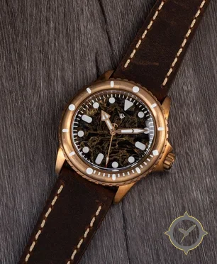 Eine Taucheruhr-Uhr mit einem markanten 43.5mm Auftritt am Handgelenk, gefertigt aus Bronze mit einem Zifferblatt in schwarz und einer besonderen "marbled gold veining"-Oberfläche.