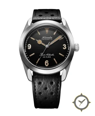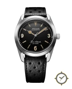 Eine Vintage-Uhr mit einem vielseitigen 38mm Gehäuse, das an fast jedes Handgelenk passt, gefertigt aus Edelstahl mit einem Zifferblatt in schwarz und einer besonderen "glossy lacquer"-Oberfläche.