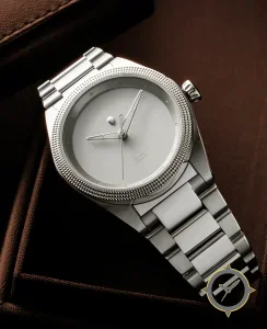 Eine Minimalistisch-Uhr mit einem 33.5mm Gehäuse im Vintage-Stil gefertigt aus Edelstahl mit einem Zifferblatt in weiß und einer besonderen "matte"-Oberfläche.