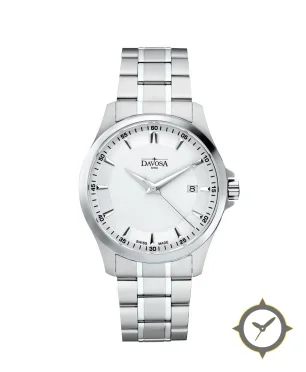 Eine Dress-Uhr mit einem markanten 43mm Auftritt am Handgelenk, gefertigt aus Edelstahl mit einem Zifferblatt in weiß und einer besonderen "matte"-Oberfläche.