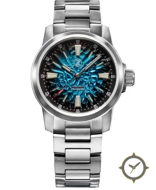 Eine Sport-Uhr mit einem vielseitigen 41mm Gehäuse, das an fast jedes Handgelenk passt, gefertigt aus Edelstahl mit einem Zifferblatt in türkis und einer besonderen "hammered guilloche / wave-like textured finish"-Oberfläche.
