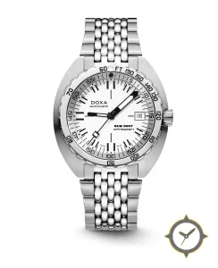 Eine Taucheruhr-Uhr mit einem vielseitigen 41mm Gehäuse, das an fast jedes Handgelenk passt, gefertigt aus Edelstahl mit einem Zifferblatt in weiß und einer besonderen "pearl lacquer"-Oberfläche.