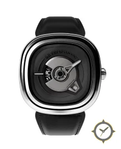 Eine Luxus-Uhr mit einem 37.5mm Gehäuse im Vintage-Stil gefertigt aus Edelstahl mit einem Zifferblatt in schwarz und einer besonderen "multi-layered industrial finish with brushed metal disc"-Oberfläche.