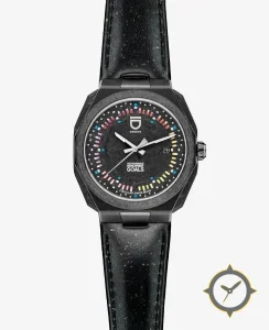 Eine Sport-Uhr mit einem 36.5mm Gehäuse im Vintage-Stil gefertigt aus Carbon mit einem Zifferblatt in schwarz und einer besonderen "forged carbon / recycled composite"-Oberfläche.