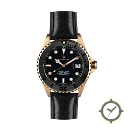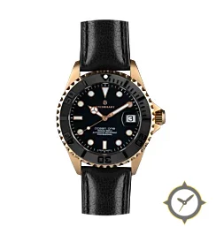 Eine Taucheruhr-Uhr mit einem 36.5mm Gehäuse im Vintage-Stil gefertigt aus Gold mit einem Zifferblatt in schwarz und einer besonderen "gloss"-Oberfläche.
