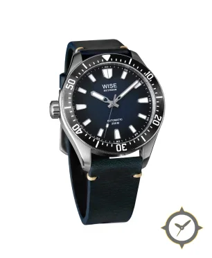 Eine Taucheruhr-Uhr mit einem 37.5mm Gehäuse im Vintage-Stil gefertigt aus Edelstahl mit einem Zifferblatt in marineblau und einer besonderen "sunburst"-Oberfläche.