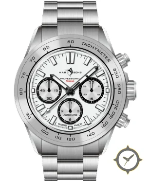 Eine Racing-Uhr mit einem markanten 49.5mm Auftritt am Handgelenk, gefertigt aus Edelstahl mit einem Zifferblatt in weiß und einer besonderen "matte"-Oberfläche.