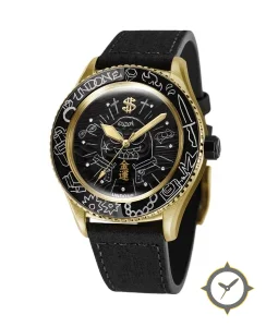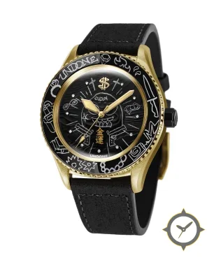Eine Luxus-Uhr mit einem vielseitigen 39.5mm Gehäuse, das an fast jedes Handgelenk passt, gefertigt aus Gold mit einem Zifferblatt in schwarz und einer besonderen "engraved/relief texture with wave-like finish"-Oberfläche.