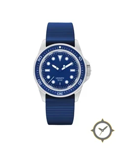 Eine Taucheruhr-Uhr mit einem 36.5mm Gehäuse im Vintage-Stil gefertigt aus Edelstahl mit einem Zifferblatt in blau und einer besonderen "matte"-Oberfläche.