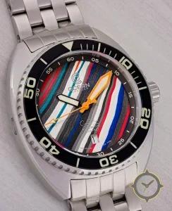 Eine Taucheruhr-Uhr mit einem markanten 52mm Auftritt am Handgelenk, gefertigt aus Edelstahl mit einem Zifferblatt in weiß und einer besonderen "multicolored striped"-Oberfläche.