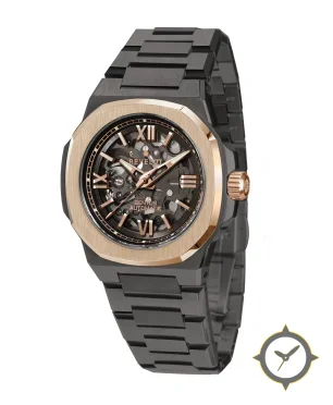 Eine Skelett-Uhr mit einem 36.5mm Gehäuse im Vintage-Stil gefertigt aus Edelstahl mit einem Zifferblatt in schwarz und einer besonderen "skeleton"-Oberfläche.