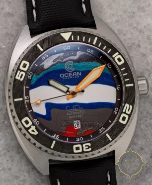 Eine Taucheruhr-Uhr mit einem markanten 47mm Auftritt am Handgelenk, gefertigt aus Edelstahl mit einem Zifferblatt in blau und einer besonderen "multi-layered painted/enamel topographic texture"-Oberfläche.