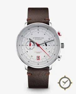 Eine Chronograph-Uhr mit einem markanten 45.5mm Auftritt am Handgelenk, gefertigt aus Edelstahl mit einem Zifferblatt in weiß und einer besonderen "matte"-Oberfläche.