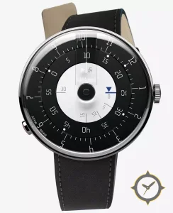 Eine Minimalistisch-Uhr mit einem markanten 46mm Auftritt am Handgelenk, gefertigt aus Edelstahl mit einem Zifferblatt in schwarz und einer besonderen "matte"-Oberfläche.
