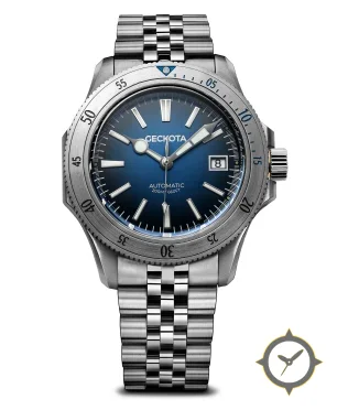 Eine Taucheruhr-Uhr mit einem vielseitigen 39.5mm Gehäuse, das an fast jedes Handgelenk passt, gefertigt aus Edelstahl mit einem Zifferblatt in blau und einer besonderen "sunburst"-Oberfläche.