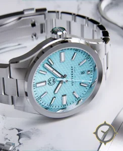 Eine Sport-Uhr mit einem 32.5mm Gehäuse im Vintage-Stil gefertigt aus Edelstahl mit einem Zifferblatt in türkis und einer besonderen "triangular guilloche texture"-Oberfläche.