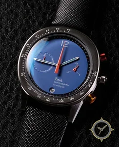 Eine Chronograph-Uhr mit einem 35.5mm Gehäuse im Vintage-Stil gefertigt aus Edelstahl mit einem Zifferblatt in blau und einer besonderen "lacquer"-Oberfläche.