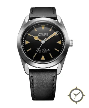 Eine Vintage-Uhr mit einem vielseitigen 41mm Gehäuse, das an fast jedes Handgelenk passt, gefertigt aus Edelstahl mit einem Zifferblatt in schwarz und einer besonderen "matte"-Oberfläche.