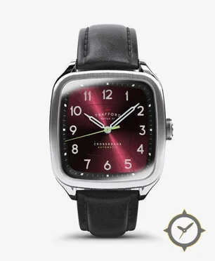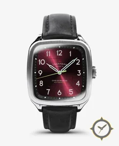 Eine Dress-Uhr gefertigt aus Edelstahl mit einem Zifferblatt in rot und einer besonderen "sunburst"-Oberfläche.