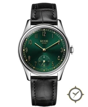 Eine Dress-Uhr mit einem vielseitigen 41mm Gehäuse, das an fast jedes Handgelenk passt, gefertigt aus Edelstahl mit einem Zifferblatt in grün und einer besonderen "sunburst/gradient"-Oberfläche.
