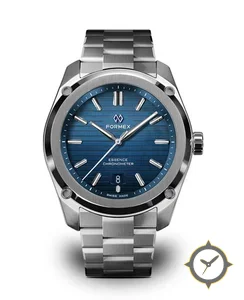 Eine Sport-Uhr mit einem markanten 47.5mm Auftritt am Handgelenk, gefertigt aus Edelstahl mit einem Zifferblatt in blau und einer besonderen "horizontal stripes (teak-style)"-Oberfläche.