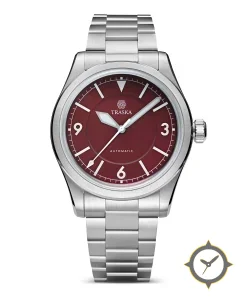 Eine Field-Uhr mit einem markanten 42.5mm Auftritt am Handgelenk, gefertigt aus Edelstahl mit einem Zifferblatt in karmesinrot und einer besonderen "matte"-Oberfläche.