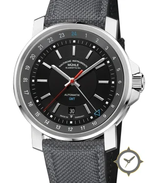Eine GMT-Uhr mit einem vielseitigen 38.5mm Gehäuse, das an fast jedes Handgelenk passt, gefertigt aus Edelstahl mit einem Zifferblatt in schwarz und einer besonderen "matte with concentric rings"-Oberfläche und einer echten GMT-Funktion, mit der du eine zweite Zeitzone verfolgen kannst.