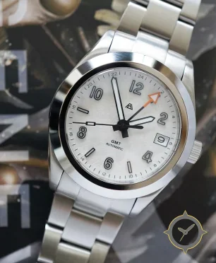 Eine GMT-Uhr mit einem 33mm Gehäuse im Vintage-Stil gefertigt aus Edelstahl mit einem Zifferblatt in weiß und einer besonderen "mother-of-pearl / subtle frosted texture"-Oberfläche und einer echten GMT-Funktion, mit der du eine zweite Zeitzone verfolgen kannst.