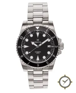 Eine Taucheruhr-Uhr mit einem 36mm Gehäuse im Vintage-Stil gefertigt aus Edelstahl mit einem Zifferblatt in schwarz und einer besonderen "matte"-Oberfläche.