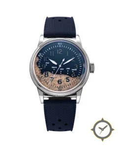 Eine Pilot-Uhr gefertigt aus Edelstahl mit einem Zifferblatt in blau und einer besonderen "smooth upper lacquer with sand-filled lower half (textured)"-Oberfläche.
