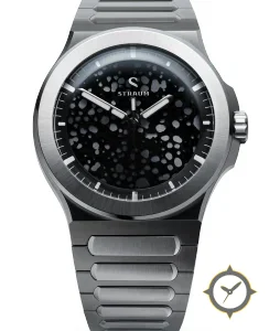 Eine Luxus-Uhr mit einem vielseitigen 41mm Gehäuse, das an fast jedes Handgelenk passt, gefertigt aus Edelstahl mit einem Zifferblatt in schwarz und einer besonderen "speckled / meteorite-like textured finish"-Oberfläche.