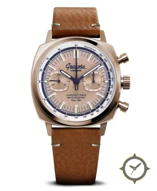 Eine Chronograph-Uhr mit einem vielseitigen 39mm Gehäuse, das an fast jedes Handgelenk passt, gefertigt aus Gold mit einem Zifferblatt in gold und einer besonderen "sunburst"-Oberfläche.