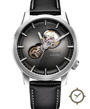 Eine Dress-Uhr mit einem markanten 43mm Auftritt am Handgelenk, gefertigt aus Edelstahl mit einem Zifferblatt in grau und einer besonderen "sunburst / brushed with open-heart cutouts"-Oberfläche.