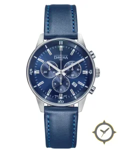 Eine Chronograph-Uhr mit einem vielseitigen 40mm Gehäuse, das an fast jedes Handgelenk passt, gefertigt aus Edelstahl mit einem Zifferblatt in blau und einer besonderen "sunburst"-Oberfläche.