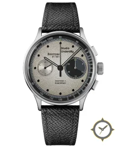 Eine Chronograph-Uhr mit einem vielseitigen 39mm Gehäuse, das an fast jedes Handgelenk passt, gefertigt aus Edelstahl mit einem Zifferblatt in silber und einer besonderen "sandblasted / grained texture"-Oberfläche.