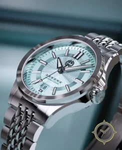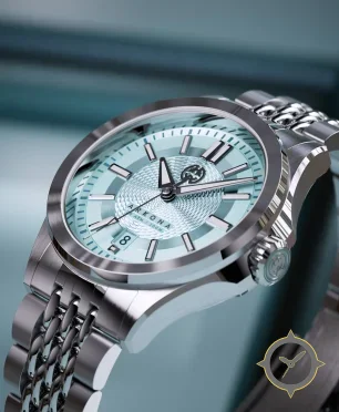Eine Sport-Uhr mit einem markanten 43mm Auftritt am Handgelenk, gefertigt aus Edelstahl mit einem Zifferblatt in türkis und einer besonderen "guilloche center with lightly brushed/sunburst outer ring"-Oberfläche.