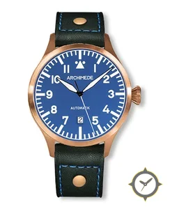 Eine Pilot-Uhr mit einem vielseitigen 40.5mm Gehäuse, das an fast jedes Handgelenk passt, gefertigt aus Bronze mit einem Zifferblatt in blau und einer besonderen "matte"-Oberfläche.