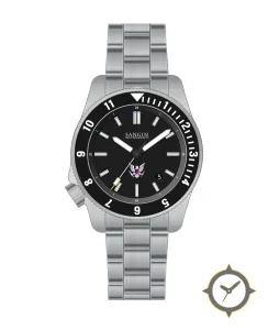 Eine Taucheruhr-Uhr mit einem markanten 43.5mm Auftritt am Handgelenk, gefertigt aus Edelstahl mit einem Zifferblatt in schwarz und einer besonderen "matte"-Oberfläche.